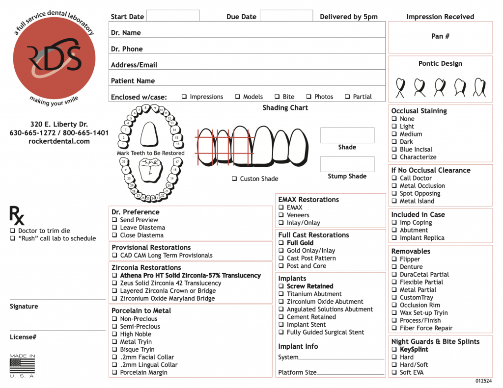 Welcome to Rockert Dental Laboratory, where precision and efficiency meet to create exceptional dental prosthetics. To streamline your workflow, we offer a convenient option for downloading and printing your laboratory lab slips directly from our website. Our easy-to-use form ensures that you can quickly provide us with all the necessary information, allowing us to deliver the highest quality dental products with speed and accuracy. Simply download the lab slip, fill it out, and include it with your case submissions. At Rockert Dental, we are committed to supporting your practice with seamless and reliable service.