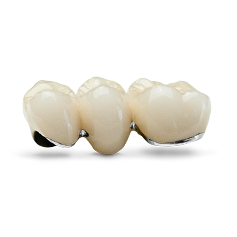 PFM, or porcelain fused to metal, crowns and bridges are a timeless and standard restoration due to their high rate of clinical success. PFM crowns are offered in High Noble, Noble, and Base Metal Alloys. The metal provides flexible stability and strength while the bonded porcelain provides the hardness, color, contour, and function. These traits mimic the performance and esthetics of dentin and enamel in natural dentition. PFM can be used for crowns, bridges (up to 14 units), and in conjunction with cast partials or implants. They are not recommended for patients with a metal allergy or if the clinical tooth crown is very short, lacking 3mm ferrule for crown retention.